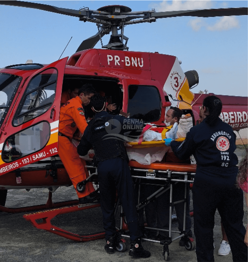 Um motoqueiro precisou ser transportado de helicóptero para atendimento hospitalar após sofrer um acidente de trânsito na Geral da Santa Lídia, em Penha, na tarde desta sexta-feira (14). Os Bombeiros Voluntários resgataram a vítima de um barranco, onde havia caído após a saída de pista. Durante o atendimento pré-hospitalar constatou-se diversas fraturas no adolescente de 16 anos que conduzia a moto, inclusive em um fêmur. A equipe da aeronave Arcanjo-03 foi solicitada para a remoção do paciente. No local, a vítima afirmou que teve contato com o retrovisor de um automóvel, o que teria ocasionado a queda. Ao final, ele foi encaminhado ao Hospital Marieta Konder Bornhausen, em Itajaí. Simultaneamente, um outro acidente de trânsito ocorreu também na Estrada Geral da Santa Lídia, este sem gravidade. Confira o vídeo a seguir.