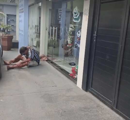 Em outro registro, a cena ocorreu em frente a um pet shop, na Praia Alegre, onde um morador de rua teria vomitado e deitado na entrada do comércio durante o expediente. “Olha a situação, pet shop aberto, sábado de sol lindo, praia cheia, movimento aqui no Algodão Doce e esse cidadão vomitando na frente da loja, com o cobertor dormindo na porta da loja aberta. Chegou a um ponto que não tem mais o que fazer. O pior é que os comerciantes não querem se indispor. O cara estava rolando até quase para dentro, abrindo a porta do comércio. Eles estão lavando os cachorrinhos lá. Agora ele está um pouquinho mais para lá. Eu já falei com a proprietária da pet, ela também queria fazer alguma coisa. Realmente é uma situação que ela estava só com funcionários mulheres. Depois eu conversei com ela e ela estava com bastante medo”, relatou uma moradora.