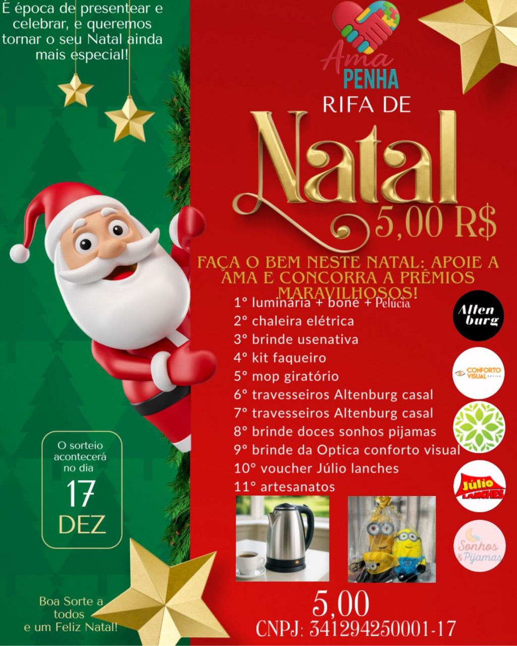 A Associação de Pais e Amigos do Autista (AMA Penha) lançou uma rifa solidária de Natal para arrecadar recursos e manter as atividades desenvolvidas pela entidade. O bilhete custa R$ 5,00 e o sorteio está marcado para o dia 17 de dezembro. Entre os prêmios estão luminária com boné e pelúcia, chaleira elétrica, kit faqueiro, mop giratório, artesanatos e diversos brindes doados por empresas parceiras, como Altenburg, Óptica Conforto Visual, Sonhos Pijamas e Júlio Lanches. Também serão sorteados travesseiros, doces e vouchers. A AMA Penha reforça que toda a renda será destinada ao atendimento de crianças e adolescentes com autismo, contribuindo para a continuidade dos projetos da instituição. Os bilhetes podem ser adquiridos com voluntários e apoiadores da associação, e o pagamento feito por meio do Pix da AMA: 34129425000117 (CNPJ).