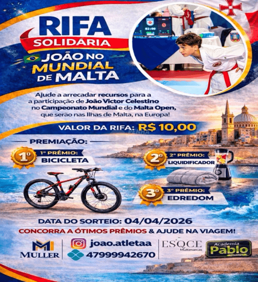 Um atleta de Penha está promovendo uma rifa solidária para viabilizar sua participação em competição internacional representando a Seleção Brasileira de Karatê. João Victor Celestino foi convocado para disputar o Campeonato Mundial e o Malta Open, que serão realizados nas Ilhas de Malta, na Europa. A rifa tem o valor de R$ 10,00 por número e o sorteio está marcado para o dia 4 de abril de 2026. Entre os prêmios estão: