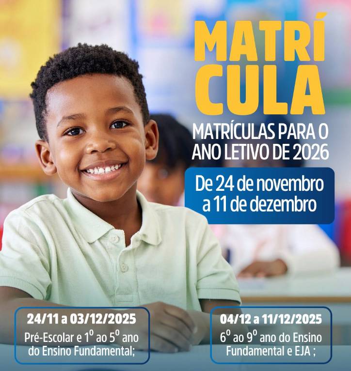 A Secretaria Municipal de Educação de Barra Velha informa que as matrículas para o ano letivo de 2026 estarão abertas de 24 de novembro a 11 de dezembro de 2025, diretamente nas Unidades Escolares Municipais, conforme disposto no Edital nº 01/SEMEC/2025, aprovado por meio do Parecer nº 002/COMED/BV/2025.