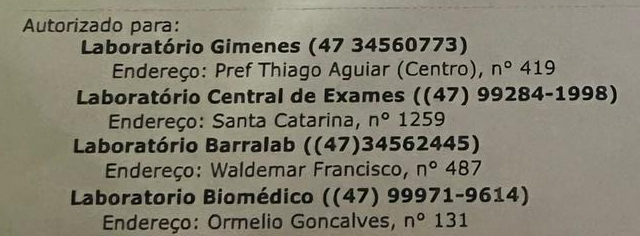 “A Secretaria da Saúde da Prefeitura de Barra Velha informa que possui 4 laboratórios credenciados, com cota mensal de vinte mil para cada laboratório, totalizando 80 mil por mês em exames. Dos 4 laboratórios credenciados, 2 estão realizando agendamento no prazo de até 20 dias, outro realiza atendimento sem necessitar de agendamento, enquanto um está com a agenda lotada por ter tido mais procura pelos pacientes. Na guia do exame, possui o endereço e contato dos 4 laboratórios credenciados, sendo possível o paciente entrar em contato para se organizar em relação a coleta do exame. Em caso de dificuldade de agendamento o paciente pode entrar em contato com a secretaria de saúde. A Secretaria também informa que está se organizando para aumentar a cota de exames mensais de cada laboratório credenciado”, afirmou a Secretaria de Saúde. Confira abaixo, a lista de laboratórios credenciados à Secretaria de Saúde Municipal de Barra Velha: