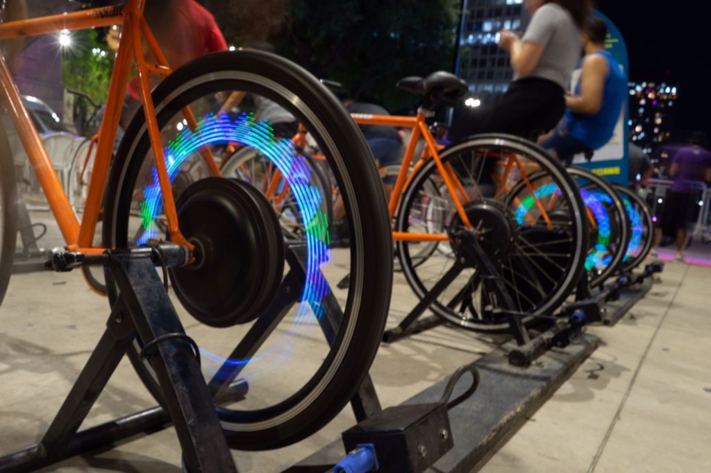 No total, são 16 estações que captam a energia gerada pelos ciclistas: 12 bicicletas fixas e quatro bases para acoplar as bicicletas trazidas pelo próprio público, caso desejem. É possível também colaborar pelo “pedal de mão”, um recurso planejado para crianças, idosos e pessoas com mobilidade reduzida.