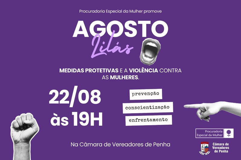 Em alusão ao Agosto Lilás – mês dedicado à conscientização pelo fim da violência contra a mulher –, a Procuradoria Especial da Mulher da Câmara de Vereadores de Penha promove na sexta-feira (22), às 19 horas, uma roda de conversa sobre medidas protetivas e a violência contra as mulheres.