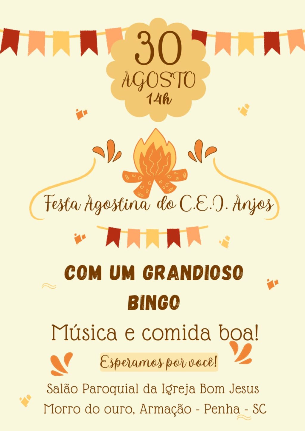 Neste sábado (30), o Centro de Educação Infantil Anjos do Itapocoroy, de Penha, promove sua Festa Agostina, com direito a bingão e tudo! O evento acontece no Salão Paroquial da Igreja Bom Jesus, no Morro do Ouro, em Armação do Itapocoroy. A festa começa às 14h e terá um grandioso bingo. Toda a comunidade está convidada.