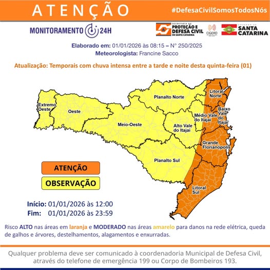 O primeiro dia de 2026 começou com tempo instável em Santa Catarina, com muitas nuvens e trovoadas isoladas no Grande Oeste. Mas é entre a tarde e a noite desta quinta-feira (1), que a instabilidade aumenta novamente e retornam as condições para temporais com raios, rajadas fortes de vento e chuva intensa em curto período de tempo especialmente em do Litoral Sul ao Litoral Norte, novamente associados à circulação dos ventos em diferentes níveis da atmosfera somada ao calor e à umidade. O risco é moderado a alto para ocorrências associadas a alagamentos, enxurradas, danos na rede elétrica, queda de galhos e árvores e destelhamentos. Vale ressaltar que a sequência de dias com chuva intensa e com volumes elevados de precipitação, amplia ainda mais o risco para ocorrências relacionadas a alagamentos e enxurradas além de deslizamentos, já que o solo está bastante encharcado.
