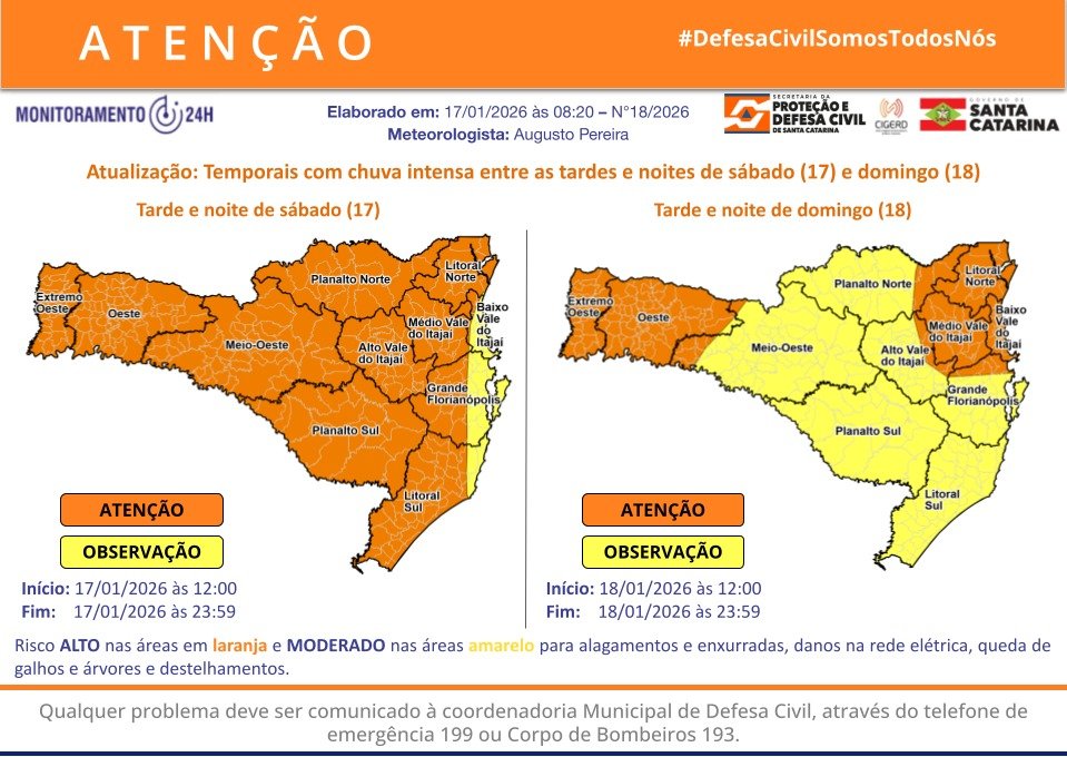 Defesa Civil de SC alerta para temporais com chuva intensa entre as tardes e noites de sábado (17) e domingo (18)
