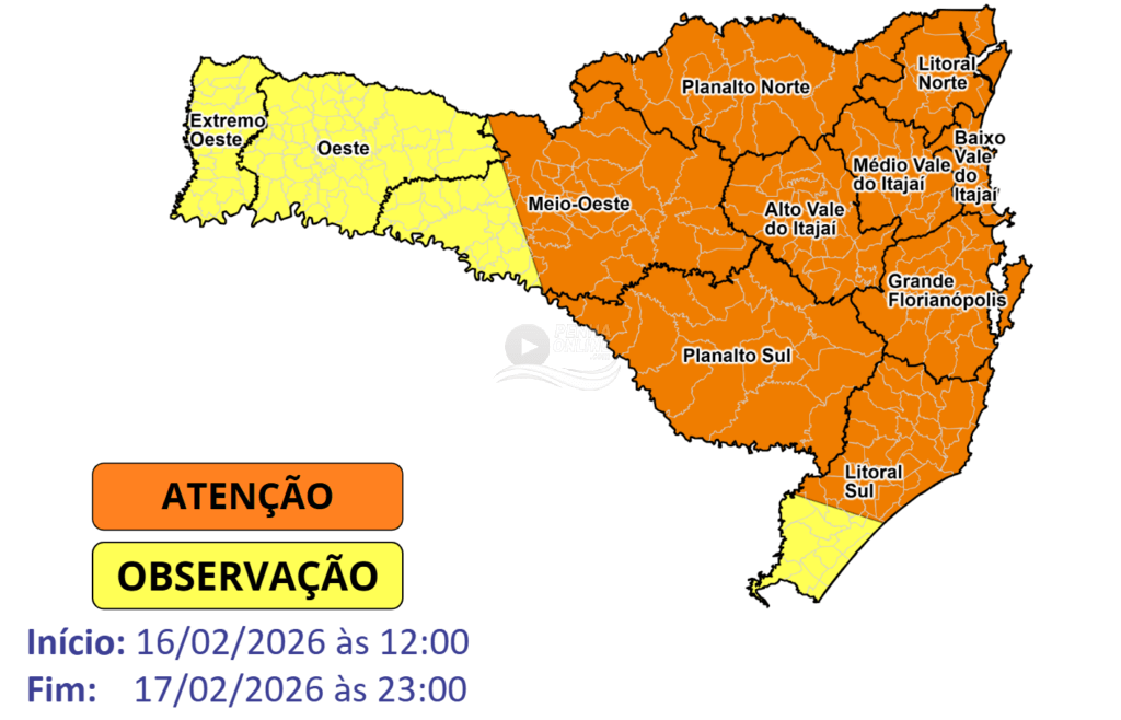 O calor intenso e a instabilidade voltam a ganhar força em Santa Catarina nesta segunda-feira (16) e na terça-feira (17), resultando em condições favoráveis para temporais entre o Meio-Oeste e o Litoral. Portanto, nestas regiões, o risco é alto para ocorrências associadas a chuva intensa, raios, rajadas de vento e queda de granizo, como alagamentos, enxurradas, destelhamentos, danos na rede elétrica e queda de galhos e árvores. Nas demais regiões, o risco é moderado. O risco para deslizamentos também permanece elevado, especialmente nas áreas que já registraram altos volumes de precipitação nos dias anteriores. A sensação de abafamento predomina devido à umidade e ao calor intenso, que contribuem para a formação desses temporais.