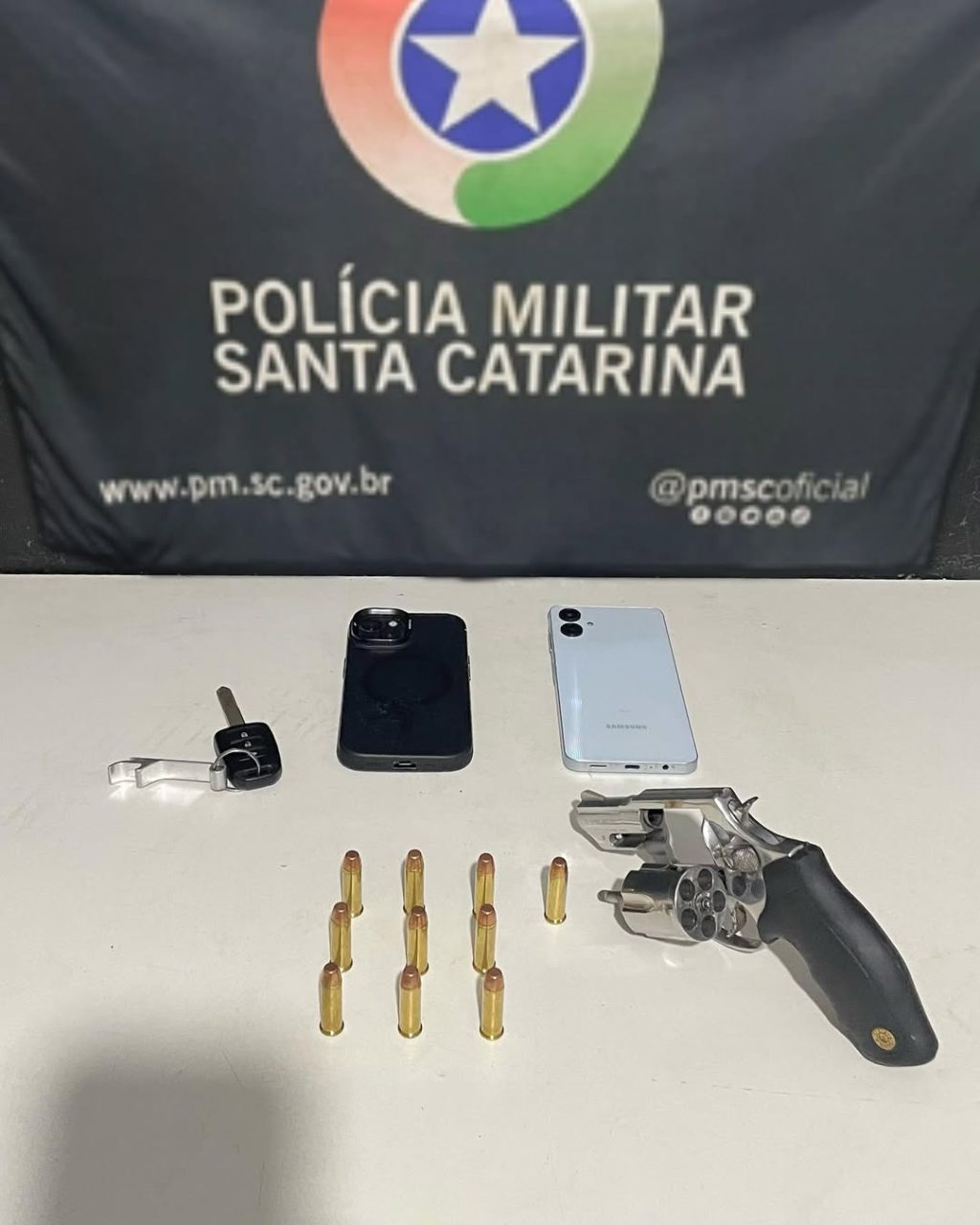 Durante a revista, os policiais encontraram um revólver calibre .38, dez munições e dois celulares. Após verificação, foi constatado que o veículo havia sido furtado em outubro de 2024, na cidade de São José dos Campos/SP, e apresentava diversas adulterações em seus sinais identificadores. Além disso, os suspeitos portavam documentos com indícios de falsificação, entre eles uma procuração pública com chave de validação inexistente nos sistemas oficiais.