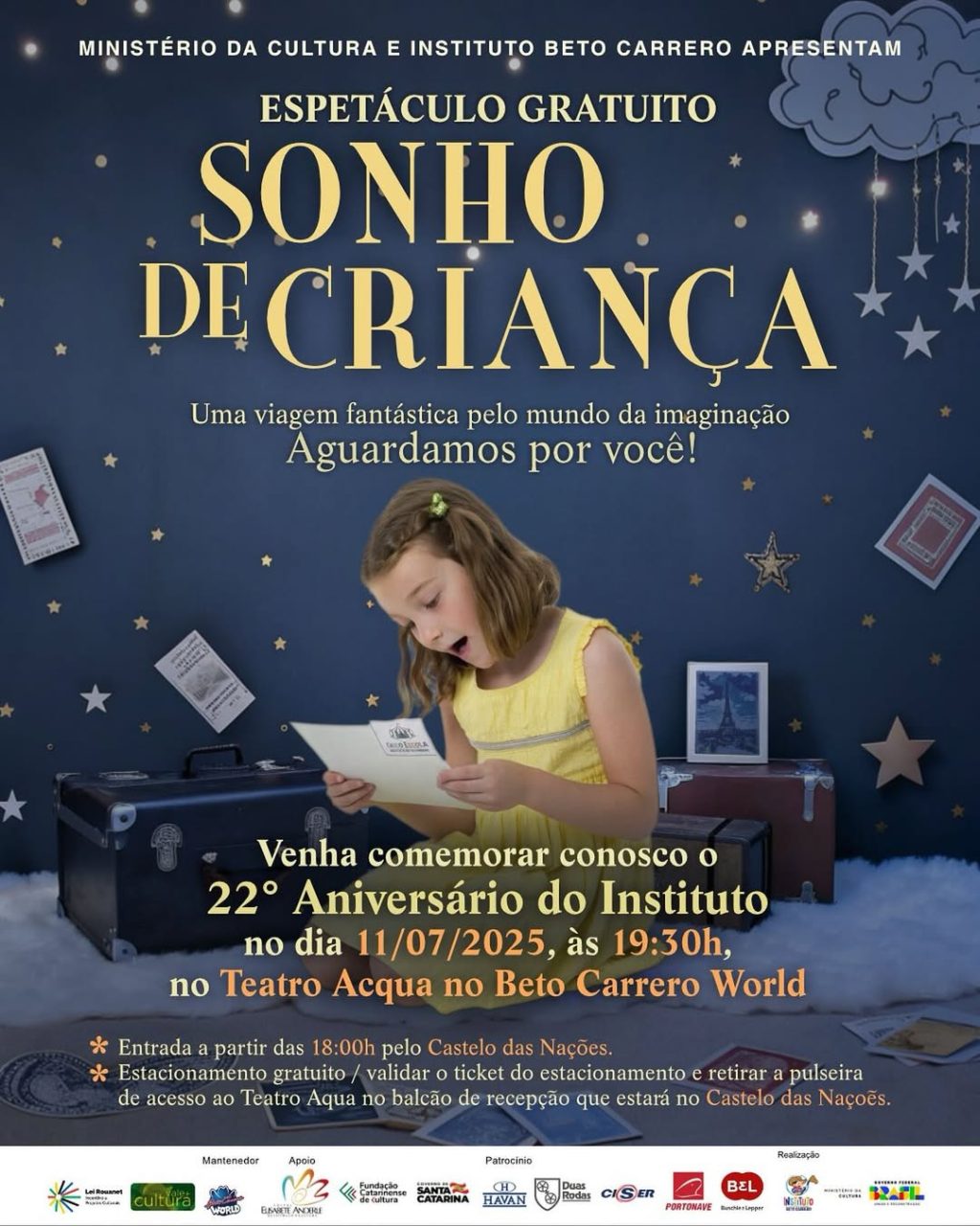 Um convite especial promete encantar famílias e fãs do universo mágico criado por Beto Carrero: o espetáculo gratuito “Sonho de Criança”, que marca o aniversário de 22 anos do Instituto Beto Carrero, será apresentado no dia 11 de julho de 2025, a partir das 19:30h, no Teatro Acqua, dentro do Beto Carrero World. A entrada será liberada a partir das 18h, pelo Castelo das Nações, e o estacionamento será gratuito — basta validar o ticket e retirar a pulseira de acesso no balcão de recepção. Voltado a todas as idades, o espetáculo promete uma noite de fantasia, emoção e muita alegria, reforçando os valores do Instituto, que há mais de duas décadas transforma vidas por meio da arte, cultura e educação. Com o tema que dá nome ao show, “Sonho de Criança”, a apresentação vai reunir elementos lúdicos, personagens marcantes e momentos especiais que resgatam a magia da infância. A entrada é gratuita, e o convite é aberto a toda a comunidade. É a oportunidade perfeita para reunir a família e viver uma noite inesquecível em um dos palcos mais icônicos do parque temático.