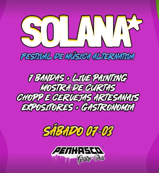 O Penhasco Pub, em Penha, recebe no dia 7 de março a terceira edição do Solana* Festival – 2026, evento voltado à música autoral e à cena independente. A iniciativa reúne artistas de diferentes cidades e reforça a proposta de valorização da produção cultural alternativa na região. Com organização independente dos produtores culturais Michel Albuquerque e Luis Fernando Machado, e apoio do músico e produtor Victor Miranda, o festival aposta na diversidade sonora e na conexão direta entre público e artistas.