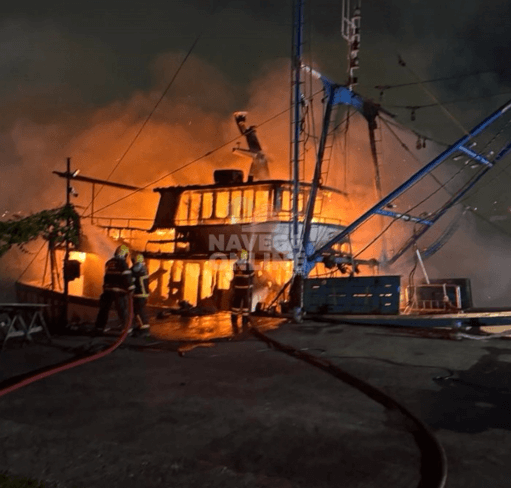 Incêndio atinge embarcação de pesca e a deixa parcialmente destruída