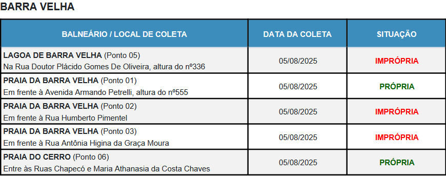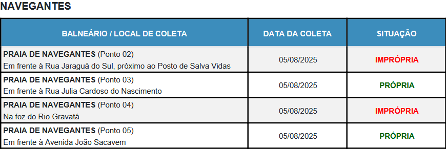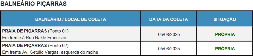 Todas as informações da pesquisa podem ser conferidas na íntegra neste link https://balneabilidade.ima.sc.gov.br/relatorio/downloadPDF/2025-08-08 . De outubro a março, o IMA realiza o monitoramento da balneabilidade das praias catarinenses semanalmente e às sextas-feiras, divulga um release com o balanço da semana. Já entre os meses de abril e setembro, a pesquisa e a divulgação são mensais.