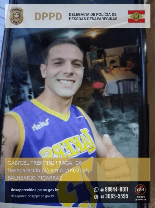 Gabriel Trentini Fraga, de 26 anos, está desaparecido há 15 dias. Gabriel foi visto pela última vez em 2 de setembro, numa localidade entre Balneário Piçarras e Penha. A população pode colaborar com informações acionando a Polícia Civil pelo WhatsApp (48) 98844-0011.