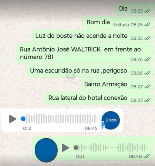 Um morador de Penha procurou o Penha Online para denunciar a dificuldade enfrentada ao tentar solicitar a troca de lâmpadas queimadas na iluminação pública. Além de informar o endereço, agora é exigido que o próprio cidadão localize e informe uma numeração específica existente em uma pequena plaqueta instalada no meio do poste. “Vê isso aqui, o absurdo. Poste sem luz na frente do número 781 ali. Vê a conversa e depois ouve o áudio que recebi”, disse o morador ao relatar a situação.