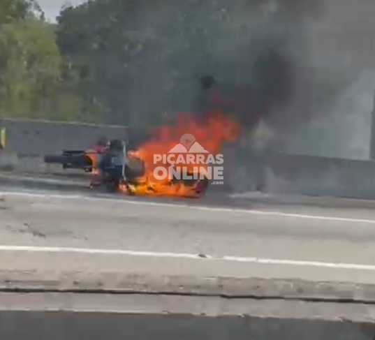 Uma motocicleta foi completamente consumida pelo fogo na tarde deste sábado (30), na BR-101, em Balneário Piçarras. O condutor do veículo seguia no sentido Sul, quando na altura do KM 99, nas proximidades de um posto de combustíveis, a moto passou a apresentar chamas. Após parar no acostamento da rodovia, o incêndio tomou conta do veículo. Equipes da Arteris Litoral Sul e Bombeiros Militares estiveram no local e realizaram a extinção do fogo. A Polícia Rodoviária Federal foi acionada para os trâmites legais. O motociclista não se feriu. Confira o vídeo abaixo.