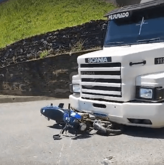 [VÍDEO] Moto vai parar embaixo de carreta no viaduto da Santa Lídia, em Penha
