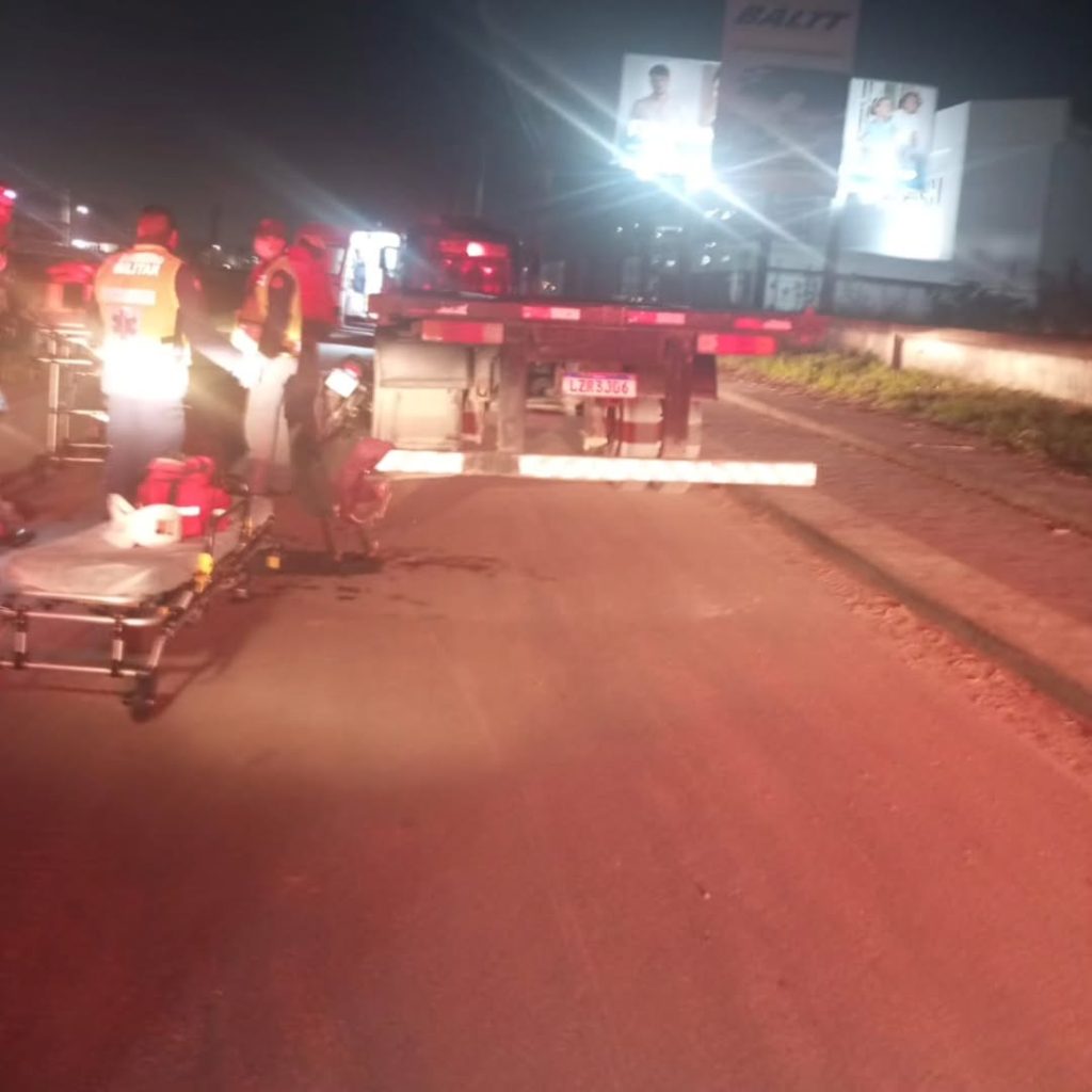 Um acidente envolvendo uma motocicleta e um caminhão deixou um homem gravemente ferido no KM 02 da BR 470, em Navegantes. O fato ocorreu quando o condutor da moto colidiu com um caminhão parado na via. A vítima sofreu ferimentos graves e foi encaminhado ao hospital de Navegantes. Participaram do atendimento os Bombeiros Voluntários e Militares, SAMU e Polícia Rodoviária Federal. A ocorrência reforça a necessidade de mais atenção por parte dos motoristas em geral e possivelmente de melhor sinalização na via portuária.