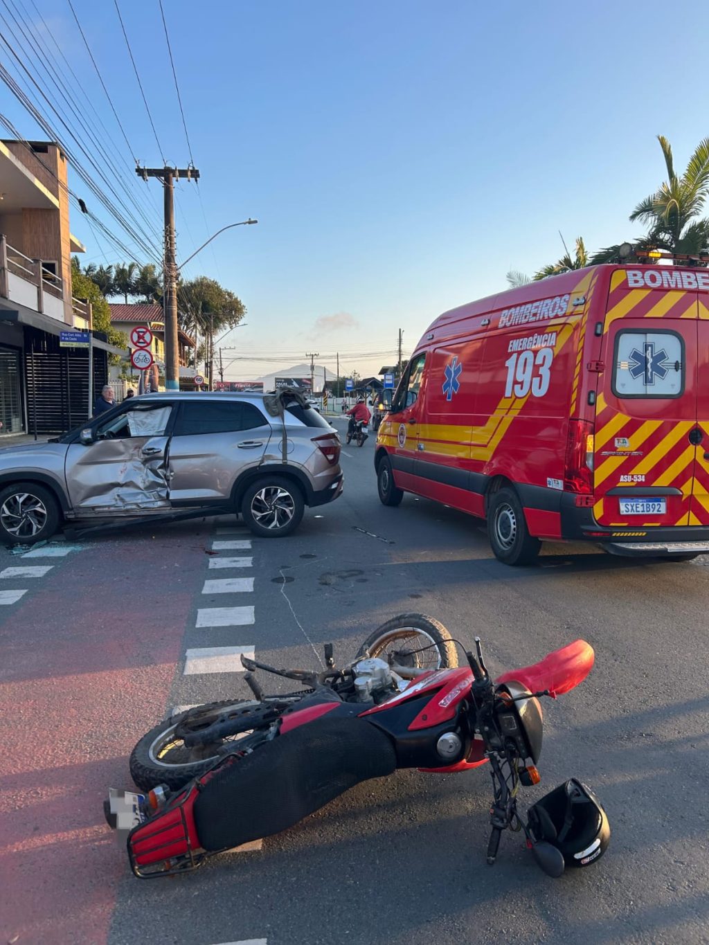 Um homem de 47 anos ficou gravemente ferido após colidir contra um carro na Avenida Prefeito José Juvenal Mafra, no bairro Meia Praia, em Navegantes. Conforme as informações dos Bombeiros Militares de Navegantes, a moto Honda Bros bateu contra a porta de um automóvel Hyundai Creta de cor prata, causando grande impacto. A vítima sofreu perda de dentes, teve ferimentos no rosto e pescoço, além de suspeita de múltiplas fraturas na perna direita e sangramento pelos ouvidos. O homem apresentava confusão mental e estava bastante agitado durante o resgate. Ele recebeu os primeiros atendimentos no local, foi imobilizado e encaminhado em estado grave ao Hospital Municipal de Navegantes. Os agentes de trânsito e a Polícia Militar também estiveram na cena, para apurar as responsabilidades.