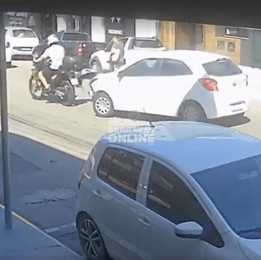 Uma motorista procura por informações que ajudem a identificar um motociclista envolvido em um acidente de trânsito registrado por uma câmera de segurança, em Barra Velha. A colisão ocorreu durante uma tentativa de ultrapassagem em local proibido, em frente a um estabelecimento comercial conhecido da região.