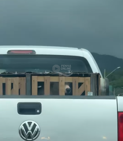 Um motorista registrou um flagrante de animais sendo transportados de forma irregular na caçamba de uma caminhonete na BR-101, sentido Penha. As imagens foram feitas por outro condutor que seguia pela rodovia e mostra um cão acomodado na parte traseira do veículo.