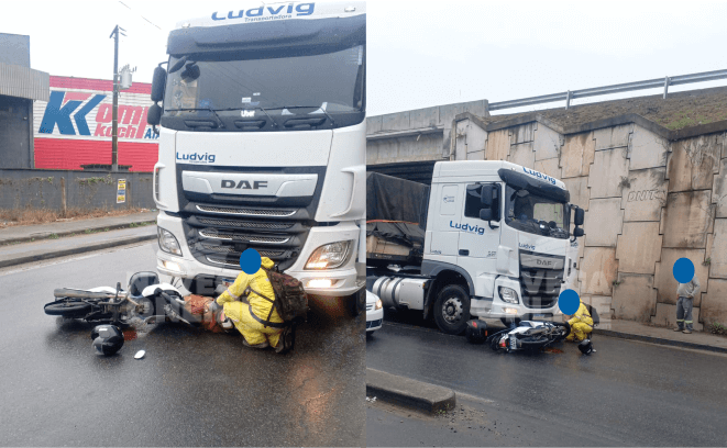 Uma mulher teve uma perna amputada na manhã desta segunda-feira (25), enquanto passava pela marginal da BR-470, em Navegantes. O acidente entre a moto que ela conduzia e um caminhão foi no bairro Nossa Senhora das Graças, altura da Rua Onório Bortolato. “Caminhão passou em cima. A perna dela já era. Eu tava do lado dela. Ela caiu na minha frente, o caminhão foi arrastando ela. Sorte que eu comecei a berrar pro caminhoneiro ali e o caminhão freou. Eu fui o primeiro a ajudar ela a sair debaixo dele”, relatou uma testemunha. Os Bombeiros Militares e SAMU foram acionados para o socorro à vítima, que foi encaminhada em estado grave para atendimento hospitalar. A Polícia Rodoviária Federal também solicitadas no local, para apurar as responsabilidades.