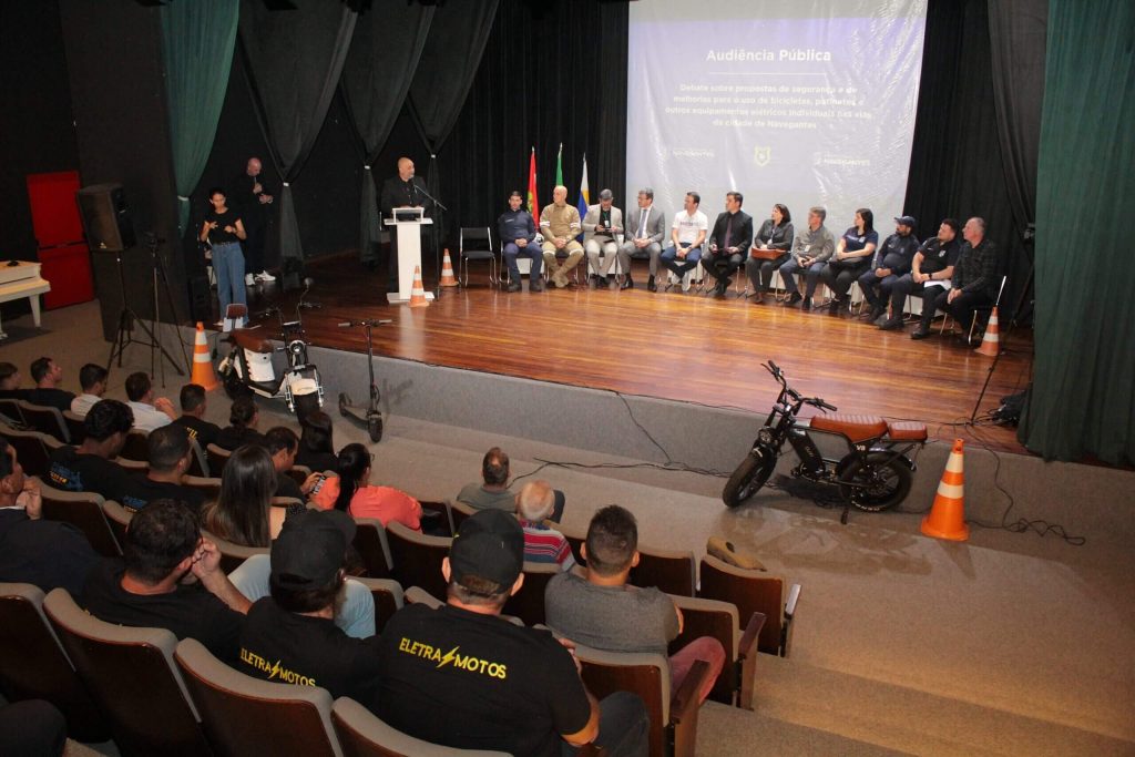 A Prefeitura de Navegantes e a Câmara de Vereadores promoveram, na noite desta terça-feira (18), no Centro Integrado de Cultura (CIC), uma audiência pública para discutir a regulamentação do uso dos equipamentos de mobilidade elétrica na cidade, como bicicletas, motos e patinetes elétricos. Com cerca de 70 pessoas presentes, entre membros da sociedade civil e do poder público, o debate avançou e algumas regras que estarão na futura legislação já foram definidas, como a idade mínima de 16 anos para os condutores.
