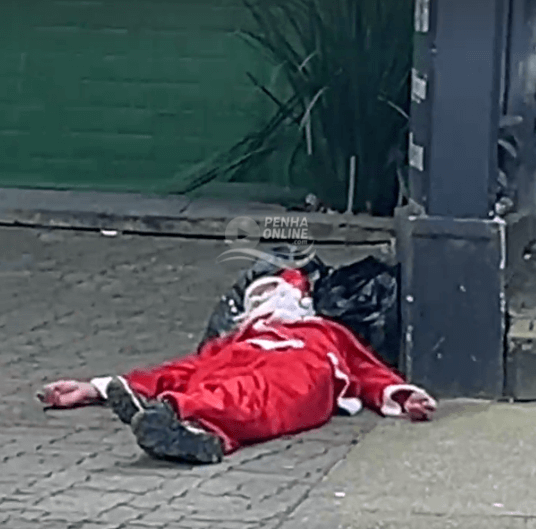 O “Papai Noel de Penha” deu o ar da graça novamente. Desta vez ele foi visto pela Libia, leitora do Penha Online, enquanto dormia numa calçada às margens da Avenida Eugênio Krause, no Centro. Ela não perdeu a chance de fazer o flagrante. “Ó lá o papai noel tirando o soninho da beleza kkkkkk”, disse ela. O Papai Noel de Penha, que neste ano apareceu com bastante antecedência, seria um pessoa em situação de rua. Recentemente ele esteve no posto de saúde de Central, onde buscava ajuda, a princípio, após ter sido agredido por outros andarilhos. Esperamos que, até dezembro, ele já tenha descansado bastante para dar conta de distribuir todos os presentes pelas chaminés da cidade. Confira o vídeo abaixo.