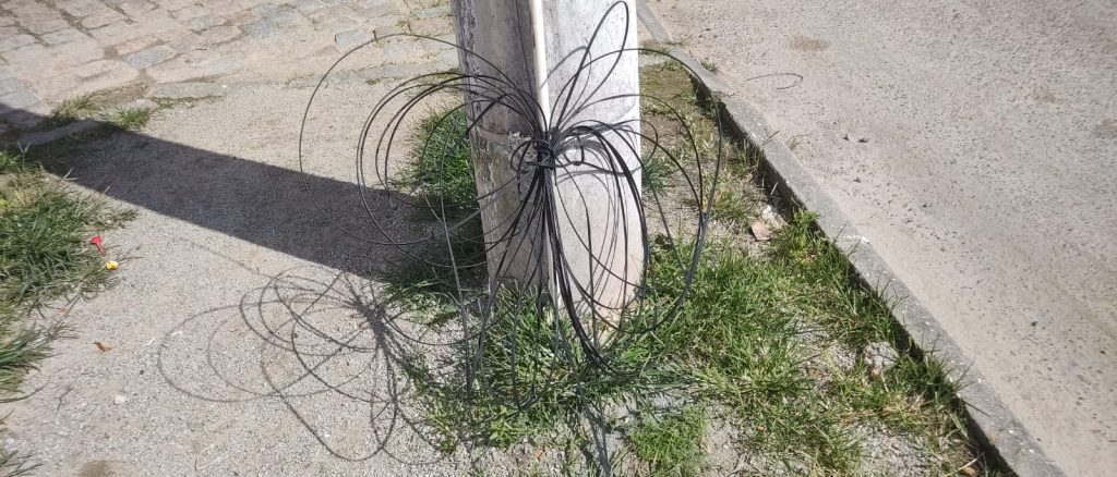 “Gostaria de trazer uma reclamação: ontem eu e meu marido estávamos caminhando até o Banco do Brasil, no Centro da Penha, quando de repente meu marido enroscou o pé nos fios de telefonia que ficam soltos no poste e por muito pouco não bate com a cara no chão. Segurei ele no reflexo! Depois ele até voltou para buscar o chinelo enroscado nos fios. Minha preocupação é, se fosse uma senhora sozinha será que teria a mesma sorte?”, questionou a reclamante.