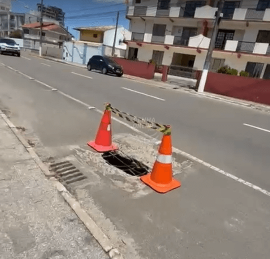 “Aqui na frente da minha casa, na Avenida Itapocoroy, o asfalto está cedendo. Um pedaço aqui já caiu, eles botaram até um cone, mas vai ceder mais ainda. Capaz de cair mais, porque tá oco o asfalto. A gente já mandou mensagem pra Secretaria de Obras, eles anotaram, mas até arrumar… antes tinham colocado uma árvore ali, uma folha bem grande e agora colocaram esses cones. Não sei quem colocou, mas colocaram, não foi a gente. A minha mãe mandou mensagem para a Secretaria de Obras, mas daquele jeito. Prefeitura para arrumar o negócio vai demorar e parece que vai cair mais. Está cedendo, está oco o asfalto. Pra alguém se machucar ali é dois toques”, relatou a moradora.
