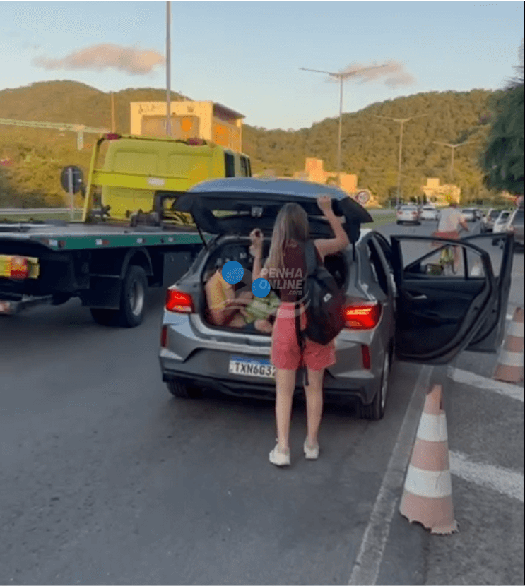 Um vídeo compartilhado por um morador com o Penha Online mostra uma cena que chamou atenção de quem passava pela Transbeto, em Penha: um veículo com excesso de ocupantes, incluindo uma criança sendo acomodada no porta-malas, enquanto uma mulher fecha o compartimento para seguirem viagem, em uma prática considerada irregular pelo Código de Trânsito Brasileiro (CTB), além de ser perigosa. “Dá uma olhada no que flagraram na saída do Beto Carrero. O verão faz coisas”, relatou o denunciante ao Penha Online. Segundo testemunhas, oito pessoas estavam dentro do veículo, que comporta apenas cinco.