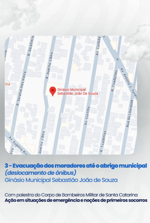 No abrigo, o Corpo de Bombeiros Militar de Santa Catarina realizará uma palestra com orientações sobre segurança, prevenção e primeiros socorros, também aberta à participação popular. A ação da Secretaria de Estado da Proteção e Defesa Civil (SPDC) será realizada simultaneamente em diversos municípios catarinenses. “É a primeira vez que Penha participa de uma iniciativa como essa, e nosso principal objetivo é preparar e orientar a população para saber como agir em situações de emergência. Para isso, contamos com a participação ativa dos habitantes de Penha”, destaca a diretora da Defesa Civil de Penha, Fernanda Anselmo. A viabilização do simulado envolve a Defesa Civil municipal e estadual, a Polícia Militar de Santa Catarina, o Corpo de Bombeiros Militar de Santa Catarina, o Corpo de Bombeiros Voluntários, o Instituto Municipal do Meio Ambiente, a equipe multifuncional e agentes da Secretaria de Saúde, além das secretarias municipais de Trânsito, Educação, Planejamento, Obras, Assistência Social e Fundação Municipal de Esportes.