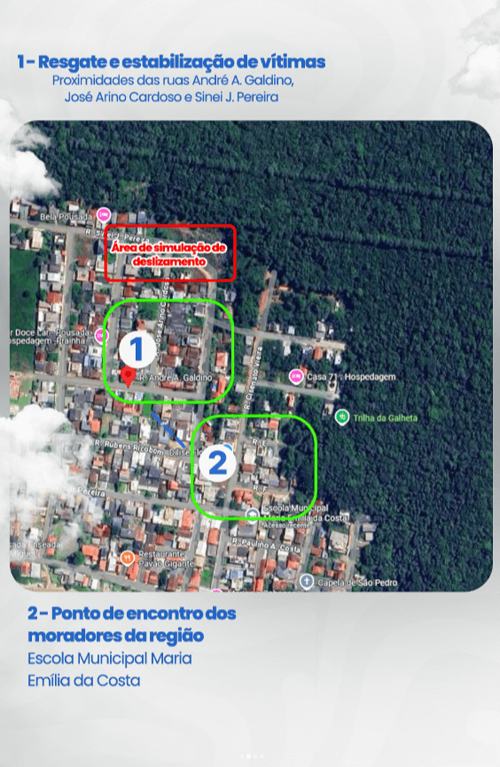 A Defesa Civil Municipal de Penha participará neste domingo, dia 18 de maio, do 1º Exercício Geral de Gestão de Desastres, ação coordenada pela Secretaria de Estado da Proteção e Defesa Civil. O evento tem como foco o treinamento de evacuação de moradores até ponto de encontro seguro e posterior deslocamento até abrigo provisório, em resposta a uma ocorrência de deslizamento de terra. A ação, que envolve diversos setores públicos e forças de segurança, acontecerá na comunidade da Praia de São Miguel, das 8h às 17h, e será aberta à participação da comunidade. Durante o simulado, haverá simulações de atendimento e estabilização de vítimas, além de treinamento de evacuação da área de risco até a Escola Municipal Maria Emília da Costa, definida como ponto de encontro. Os participantes serão deslocados ao abrigo provisório localizado no Ginásio Municipal Sebastião João de Souza, no Centro.
