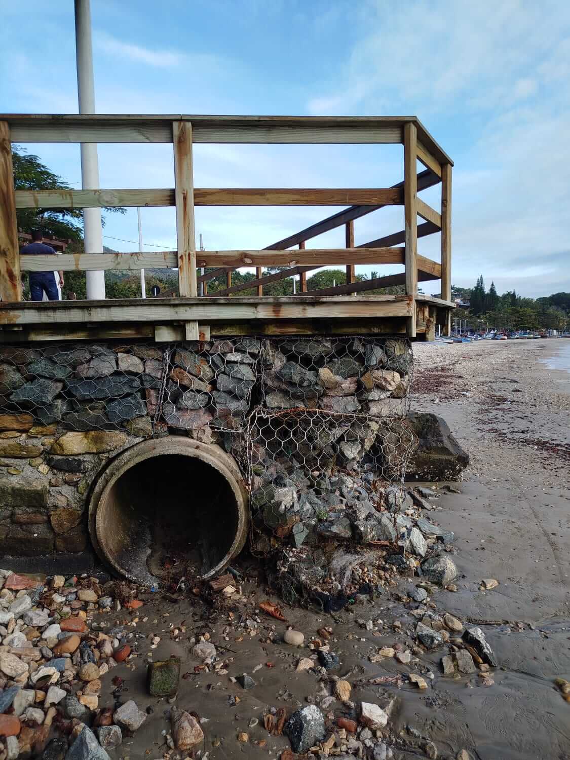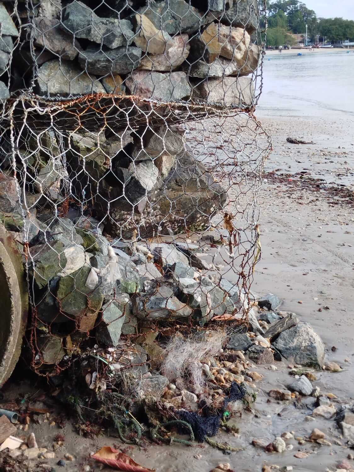 Um muro de gabião localizado abaixo de uma espécie de praça situada ao final da Rua Elizabeth Konder Reis, em Penha, está se desmanchando. O muro de gabião é uma estrutura de contenção montada por gaiolas metálicas, geralmente de aço galvanizado, preenchidas com pedras. Essas estruturas são utilizadas para a contenção de solos ou de maré, representando uma solução versátil, sustentável e econômica. No caso de Penha, infelizmente o material construído já está se desmanchando, cerca de apenas 3 anos após sua construção. “A tela já estava meio estourada. Agora tá sem as pedras. Provavelmente agora nos últimos dias, com a ressaca do mar e maré alta, levou embora”, disse uma moradora ao Penha Online.