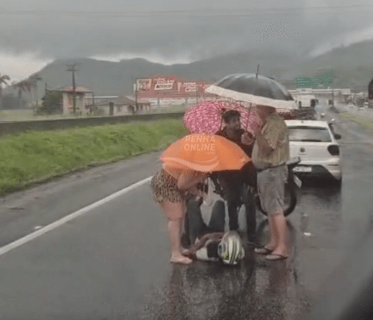 Um acidente de trânsito ocorrido na BR-101, em Penha, deixou um homem ferido na manhã deste sábado (10). Segundo o condutor da Honda Biz, um caminhão bateu no guidão da moto, momento e que ocorreu a queda. Os Bombeiros Voluntários de Penha foram acionados e encontram o motoqueiro consciente, orientado, com ferimentos abrasivos pelo corpo e bastante perda de tecidos. Ao final do socorro inicial, ele foi conduzido ao Pronto Atendimento de Penha. Equipes da Arteris Litoral Sul também estiveram no local, KM 110 da rodovia, orientando o trânsito. Confira imagens no vídeo abaixo.