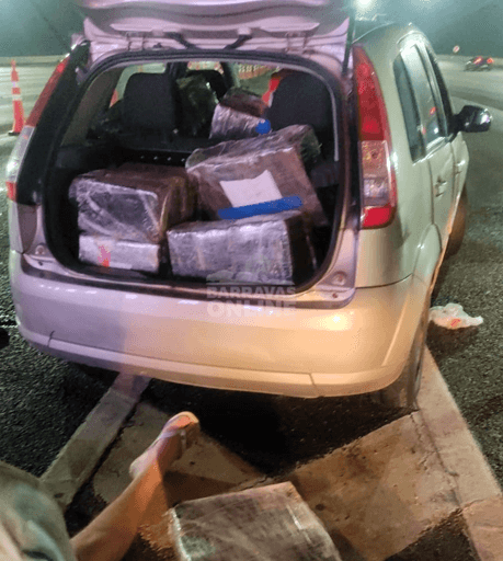 A equipe policial realizava uma fiscalização de rotina quando deu ordem de parada ao automóvel. Durante a inspeção, os agentes notaram um volume suspeito sob uma lona escura, que preenchia todo o banco traseiro e o compartimento de bagagem.