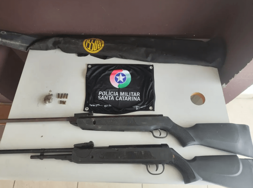 A Polícia Militar de Barra Velha apreendeu duas carabinas de pressão modificadas para uso de munição real durante ação de apoio ao CREAS, na retirada de pertences e apoio familiar no bairro Itajuba. Uma das carabinas estava carregada com munição calibre 22. Além das armas, os policiais também encontraram outras munições do mesmo calibre, estojos deflagrados e cerca de 10 gramas de substância semelhante à maconha. Os materiais foram apreendidos e encaminhados para os procedimentos legais. A Polícia Militar de Barra Velha mantém canais de comunicação abertos para denúncias anônimas: telefone 190, aplicativo PMSC Cidadão e WhatsApp (48) 98862-7846.