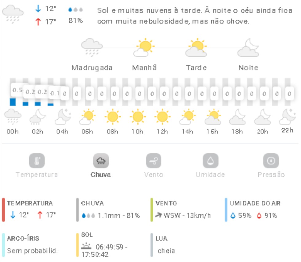 Penha Previsão do tempo Previsão do tempo para Penha: sábado, 9 de agosto 2025 8 de agosto de 2025 PUBLICIDADE Imagem: climatempo.com.br Continue Reading Anterior 1ª Conferência Livre de Políticas Públicas para as Mulheres reuniu público de mais de 100 pessoas em PenhaSeguinte [VÍDEO] Mulher em surto psicótico causa pânico em posto de combustíveis em Penha Publicações mais recentes A voz do povo Penha Trânsito [VÍDEO] Vizinhos de cruzamento do Gravatá com a Santa Lídia pedem medidas de segurança após mais um acidente de trânsito 7 de março de 2026 A voz do povo Esporte Penha Edital do Bolsa Atleta vira alvo de reclamações em Penha 7 de março de 2026 A voz do povo Educação Penha Trânsito Problema com rota de ônibus com estudantes de Penha faz crianças chegarem muito tarde em casa; pais reclamam 7 de março de 2026