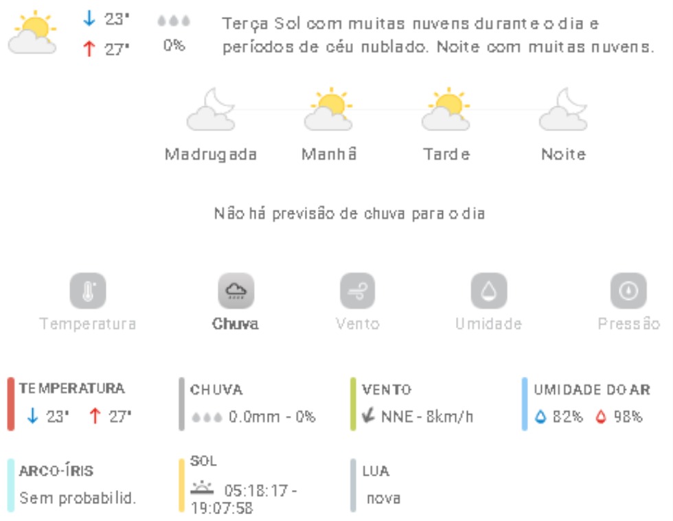 Penha Previsão do tempo Previsão do tempo para Penha: terça-feira, 23 de dezembro 2025 22 de dezembro de 2025 PUBLICIDADE Imagem: climatempo.com.br Continue Reading Anterior [VÍDEO] Penha: comerciantes se unem e removem montanha de entulhos da Praia de São MiguelSeguinte [VÍDEO] Mais um óbito por atropelamento é registrado em Penha Publicações mais recentes A voz do povo Esporte Penha Edital do Bolsa Atleta vira alvo de reclamações em Penha 7 de março de 2026 A voz do povo Educação Penha Trânsito Problema com rota de ônibus com estudantes de Penha faz crianças chegarem muito tarde em casa; pais reclamam 7 de março de 2026 A voz do povo Educação Penha ACS, ACE e professores da rede municipal de Penha indagam reajuste anual 7 de março de 2026