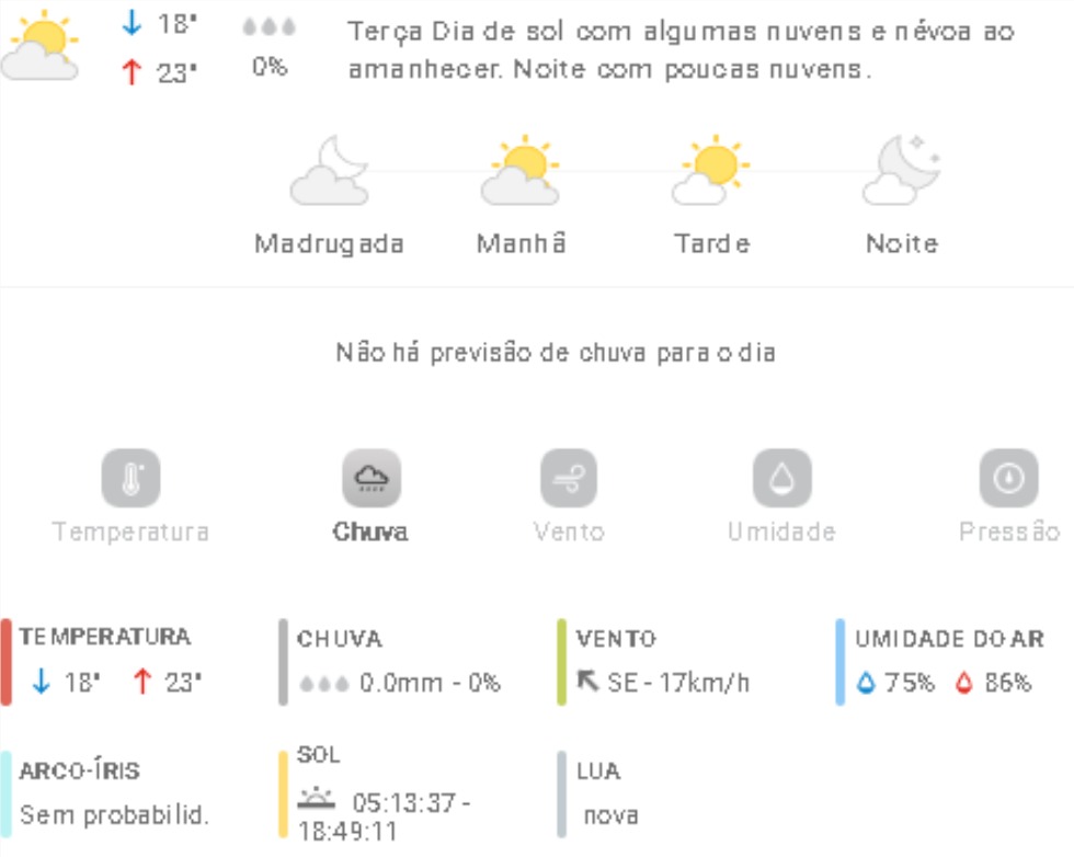 Penha Previsão do tempo Previsão do tempo para Penha: terça-feira, 25 de novembro 2025 24 de novembro de 2025 PUBLICIDADE Imagem: climatempo.com.br Continue Reading Anterior [VÍDEO] Motorista de caminhonete branca atropela cachorro e foge sem prestar socorro em PenhaSeguinte [VÍDEO] Penha: vídeo flagra remoção de meio-fio recém-instalado em menos de 24 horas Publicações mais recentes A voz do povo Esporte Penha Edital do Bolsa Atleta vira alvo de reclamações em Penha 7 de março de 2026 A voz do povo Educação Penha Trânsito Problema com rota de ônibus com estudantes de Penha faz crianças chegarem muito tarde em casa; pais reclamam 7 de março de 2026 A voz do povo Educação Penha ACS, ACE e professores da rede municipal de Penha indagam reajuste anual 7 de março de 2026