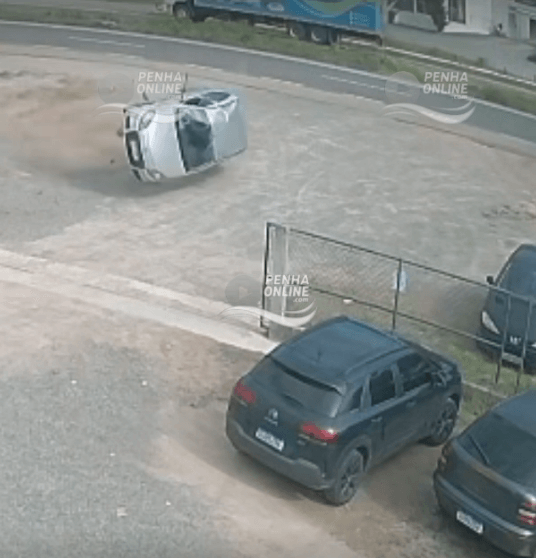Antes de parar com as rodas para cima, dentro do pátio de uma empresa, o Sandero acabou atingindo outros três veículos de funcionários do estabelecimento. Um dos ocupantes foi ejetado para fora, enquanto os outros dois ficaram presos no interior do Sandero.