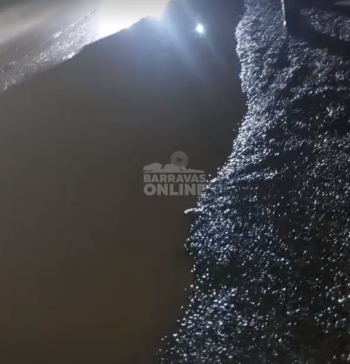 Imagens registradas durante a noite mostram a via praticamente no escuro, além de um trecho onde a água permanece acumulada na pista, dificultando a passagem de veículos e pedestres.