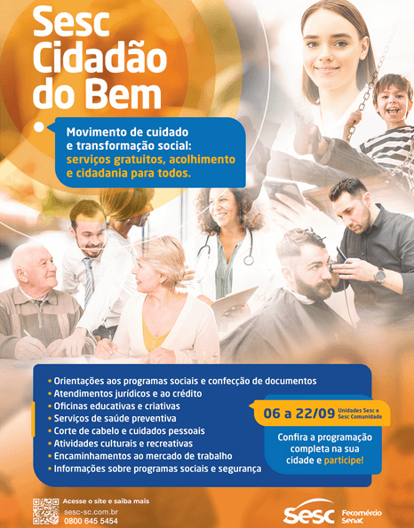 Neste sábado (13), o projeto “Sesc Cidadão do Bem” irá disponibilizar diversos serviços gratuitos para a comunidade de Penha. O objetivo do projeto é oferecer acolhimento e cidadania para todas as pessoas. Para participar, basta se dirigir ao Sesc Comunidade Penha, que se localiza na Rua Joaquim Ludgero Vieira, n° 645, no bairro Nossa Senhora de Fátima. As atividades terão início às 13:30h e o encerramento será às 17h.