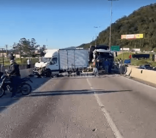 Um acidente no início da ponte sobre o rio Itajaí-Açu, em Navegantes, travou o fluxo da BR-101 e da BR-470 no fim da tarde desta quarta-feira (25). A ocorrência foi no sentido Sul da BR-101, entre dois caminhões e não deixou feridos. Neste momento, 19h, o sentido Sul da rodovia tem aproximadamente 24 quilômetros de fluxo intenso e lento, desde Barra Velha, até a ponte sobre o rio Itajaí-Açu. Já no sentido Norte, o congestionamento tem cerca de 34 quilômetros, desde o Morro do Boi, em Balneário Camboriú, até o trevo de Navegantes. A BR-470, no sentido Navegantes x Blumenau, tem congestionamento de aproximadamente 6 quilômetros. Já o sentido oposto tem pouco mais de 4 quilômetros. Confira o vídeo a seguir.
